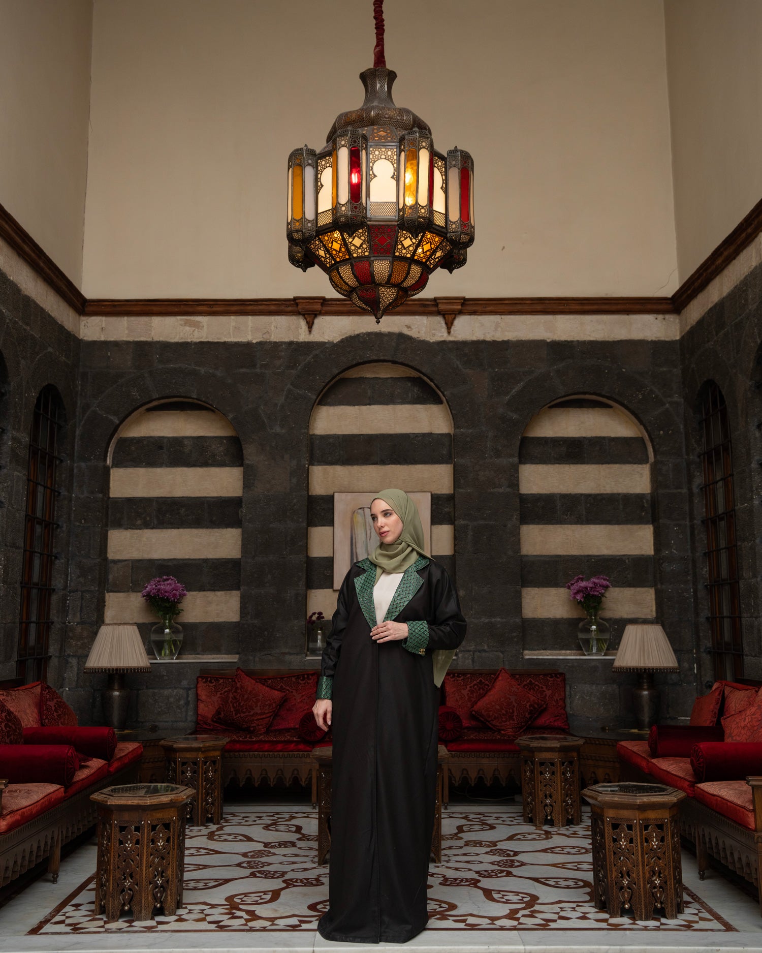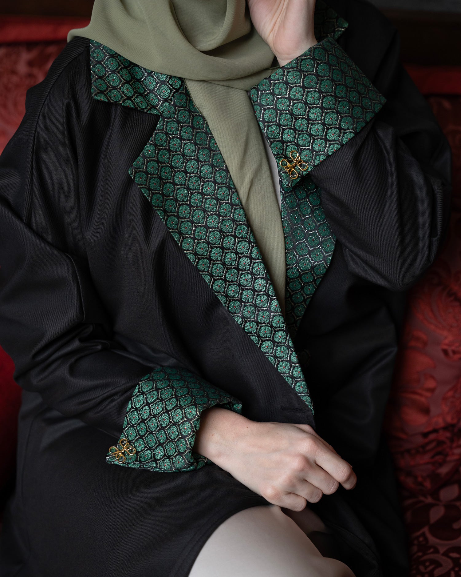A timeless abaya crafted from a refined brown fabric made of 70% wool and 30% silk, offering warmth, softness, and fluid elegance. Finished with elegant Damascene brocade detailing on the collar and sleeves, and accented with a signature H logo button for a subtle statement. The piece is sold with a satin inner dress and matching scarf, creating a complete and effortless look.
